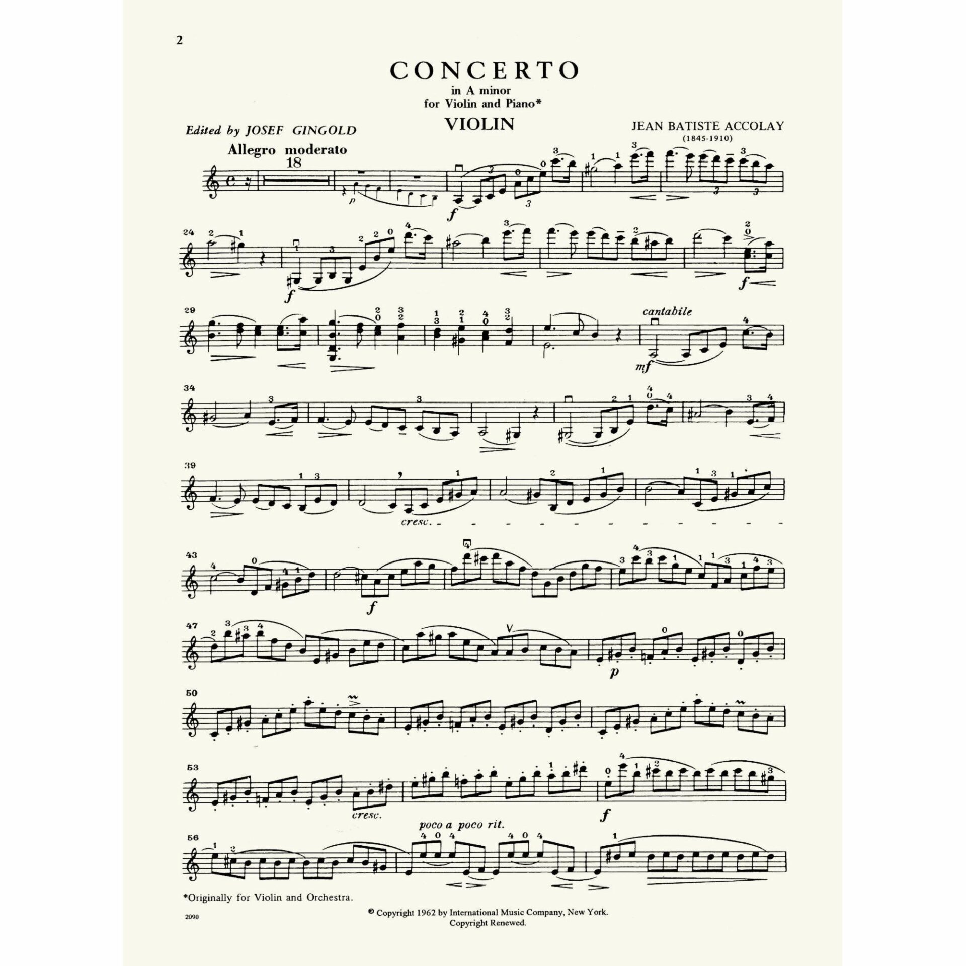 Accolay — Concerto No. 1 in A Minor for Violin and Piano