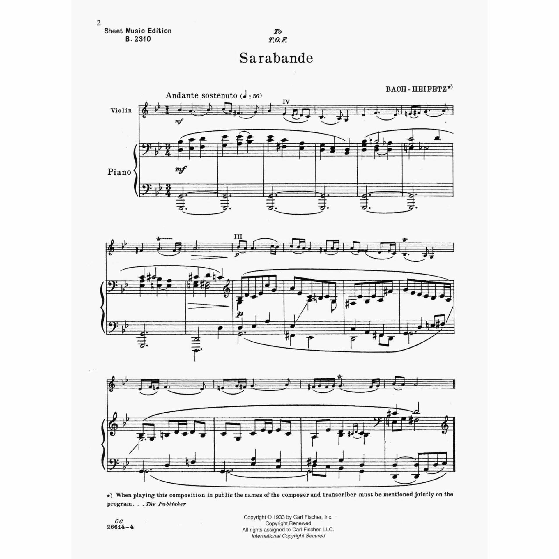 Bach — Sarabande, from English Suite No. 3, BWV 808 for Violin and Piano