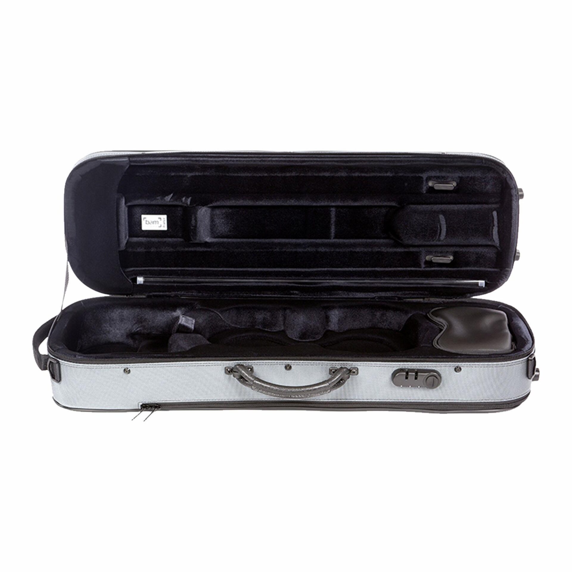 This case comes a 3 digit lock. 2 padded adjustable and removable backpack straps. A subway handle and a side handle. Large expandable sheet music pocket, and an interior removable accessory pouch. 2 Hill style bow holders, and string tube.