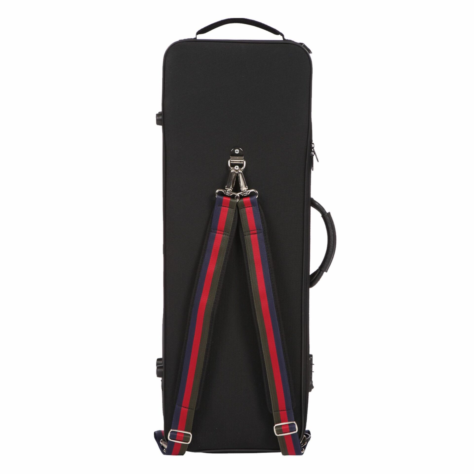 OUTSIDE FEATURES : 2 padded backpack straps, adjustable and removable subway handle, side handle, large external pocket for sheet music, 2 removable pockets in the large external pocket, flat front pocket made of reflective fabric, zipper with a combination lock for the zipper pulls, external Bam ballistic fabric that is water resistant, protective against abrasion and tear.