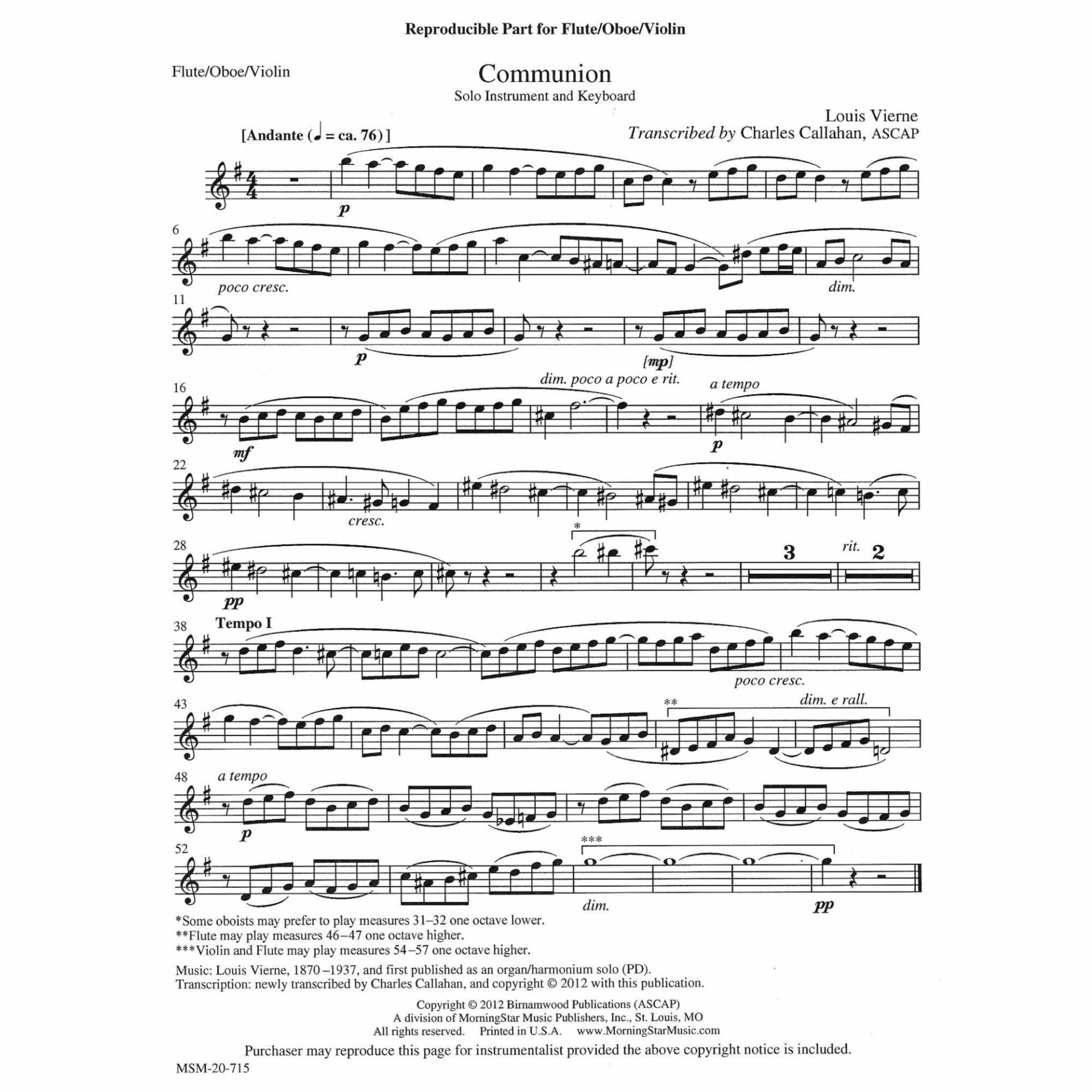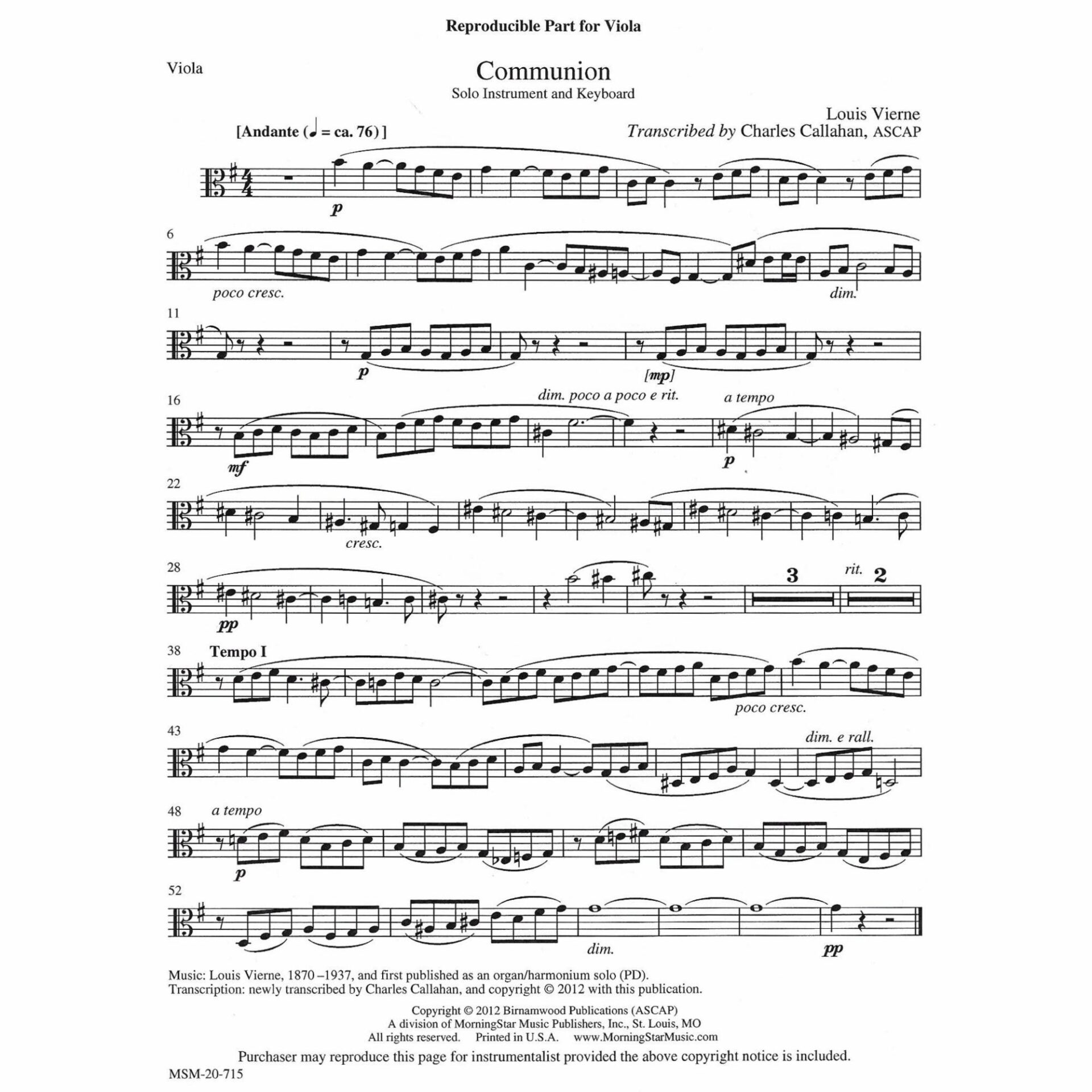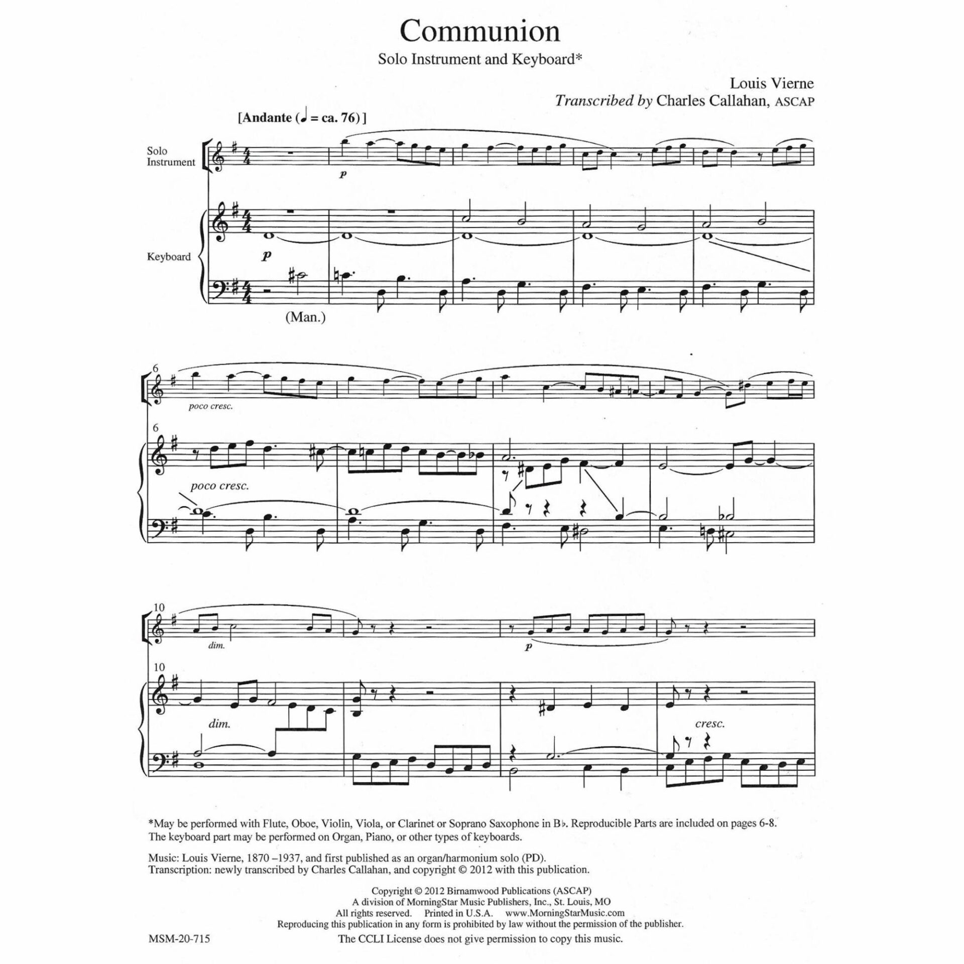 Instrumentation: Violin or viola and organ (or piano).  Also includes a version for B-flat clarinet.