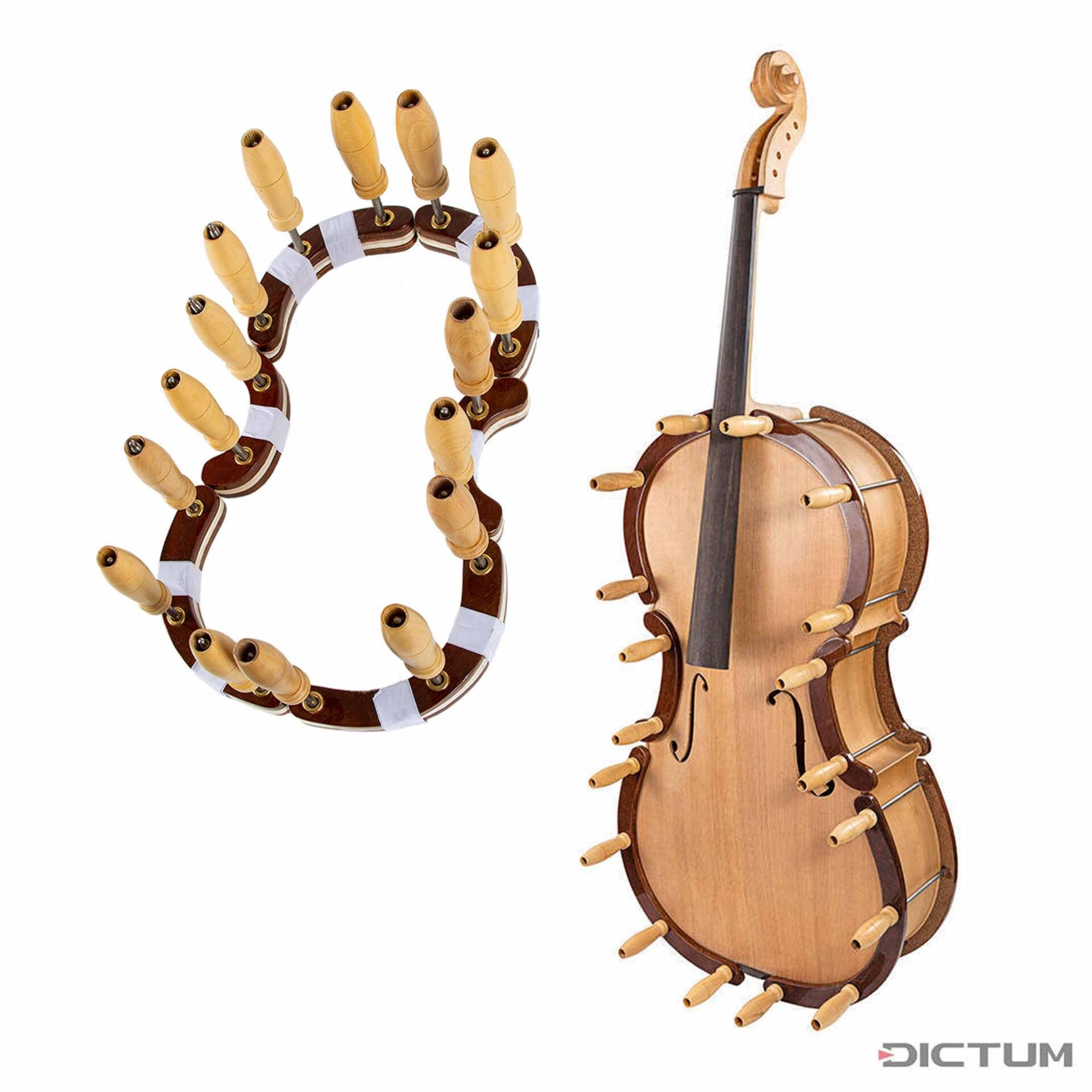 6 piece clamp set capable of gluing a plate entirely at one time. Hardwood pads with rubber lining. Boxwood handles, stainless steel spindles and bushings.