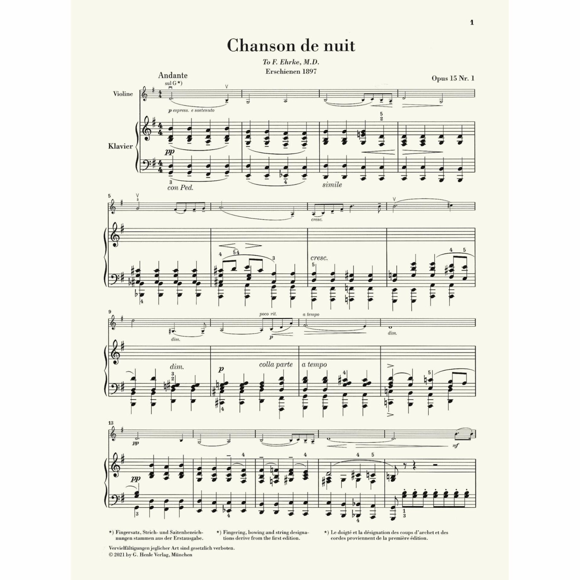 This edition includes two violin parts – one with modern technical markings (fingerings, practical bowings, etc) and another, the “urtext”, with the composer’s markings alone.