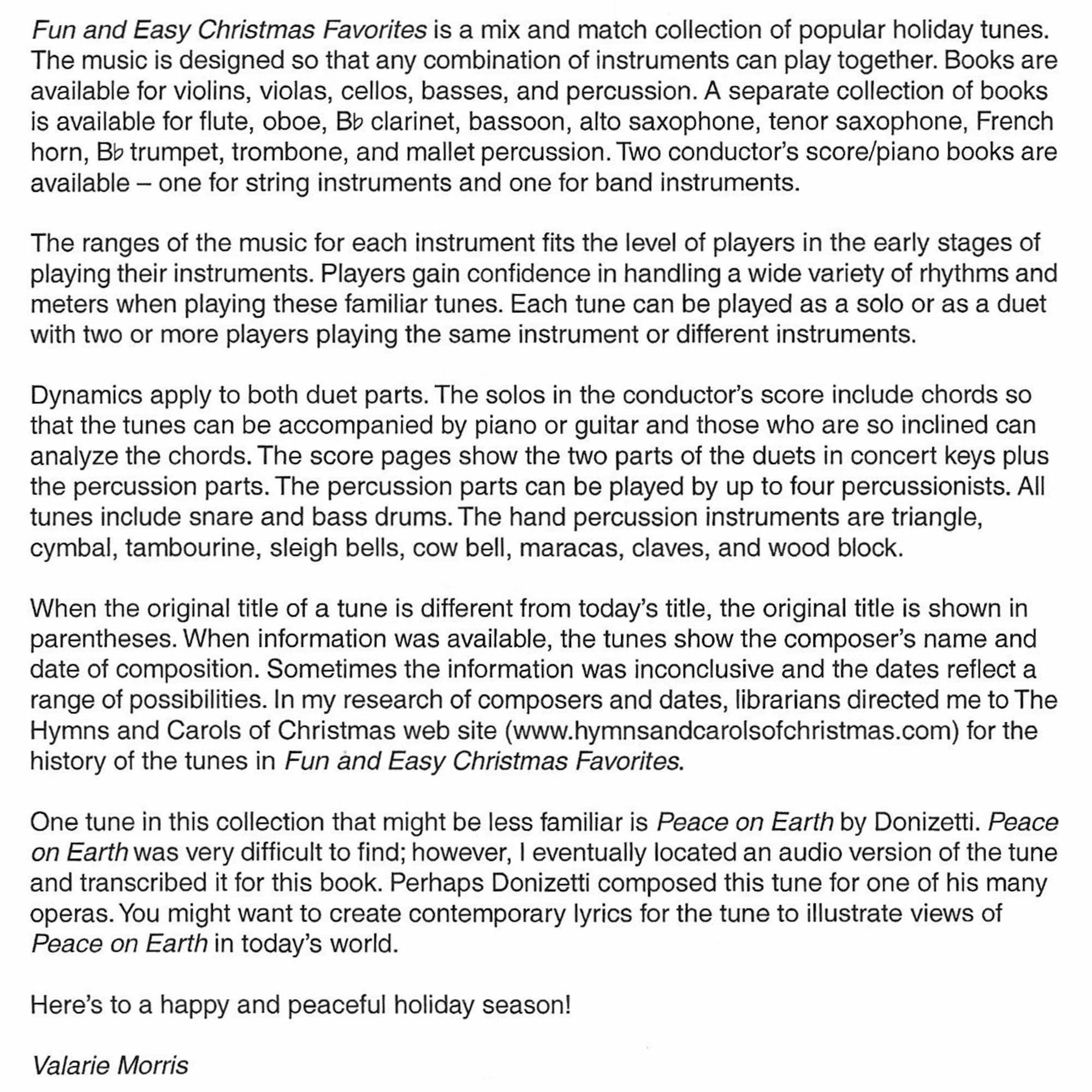 Instrumentation: Violin, viola, or cello. Each instrument book also includes a duet version of each song, and all parts are compatible across books. The score includes solo parts with chord symbols for piano or guitar, as well as a percussion accompaniment.