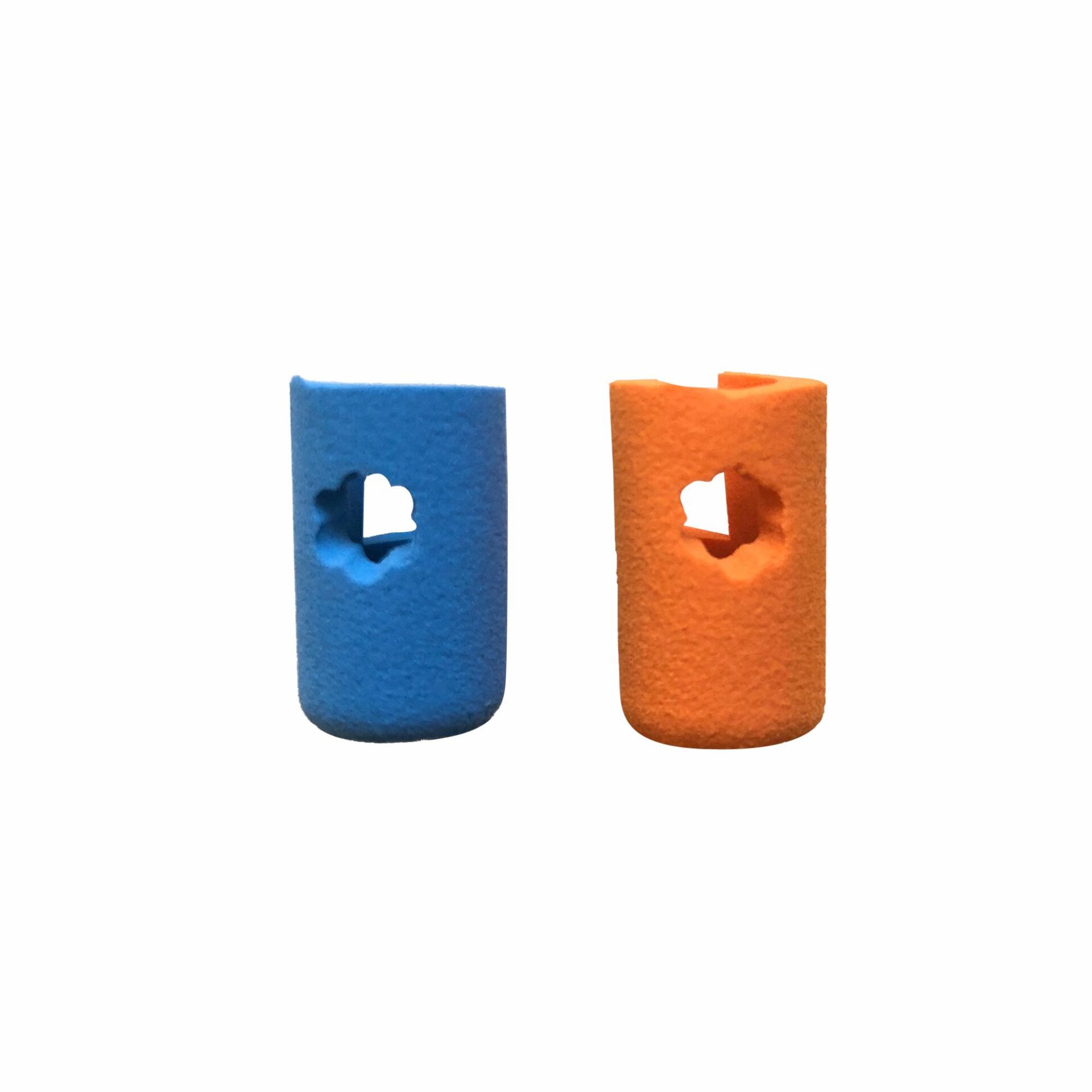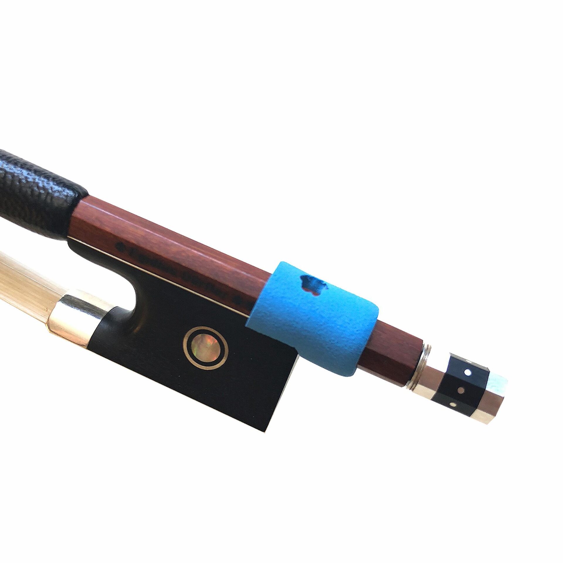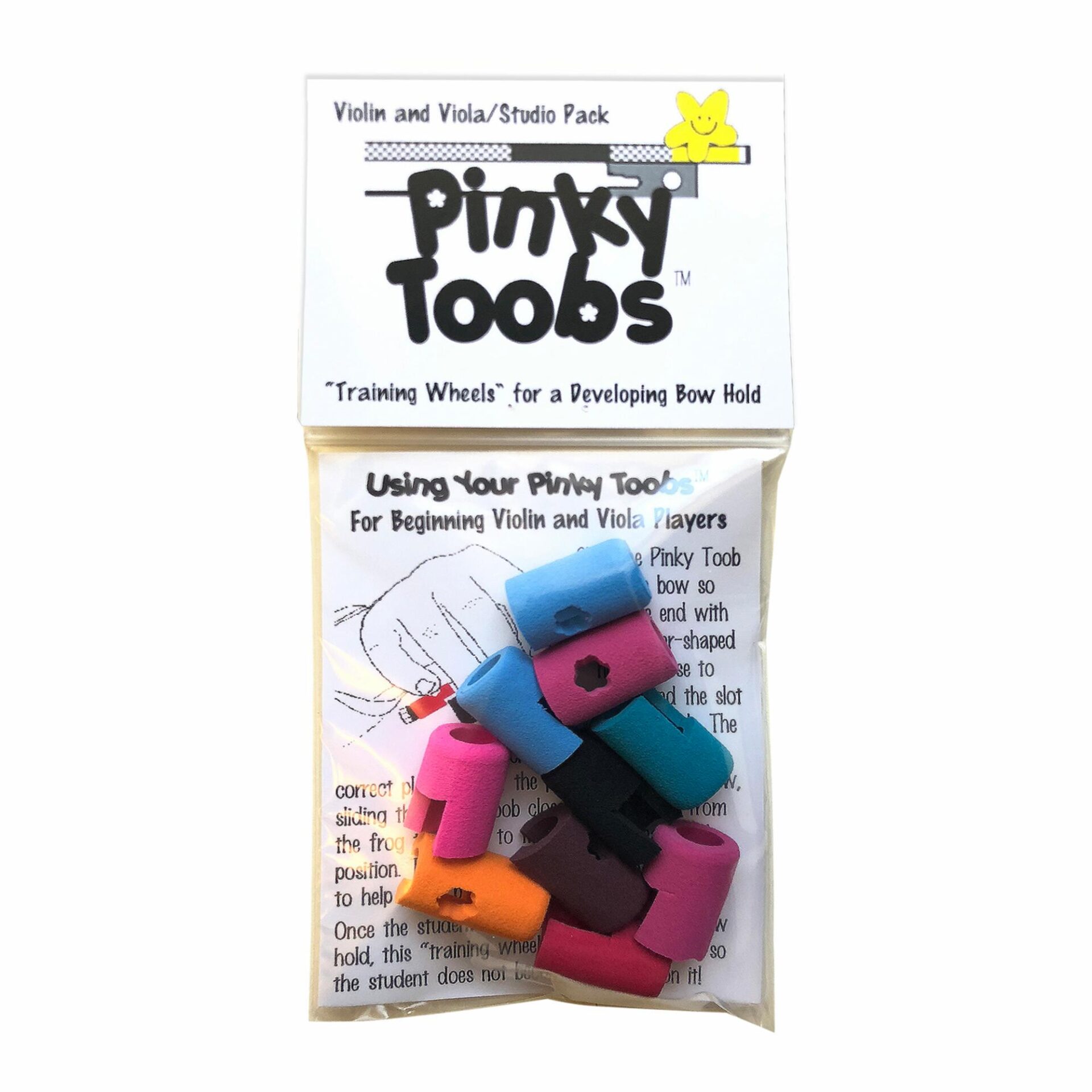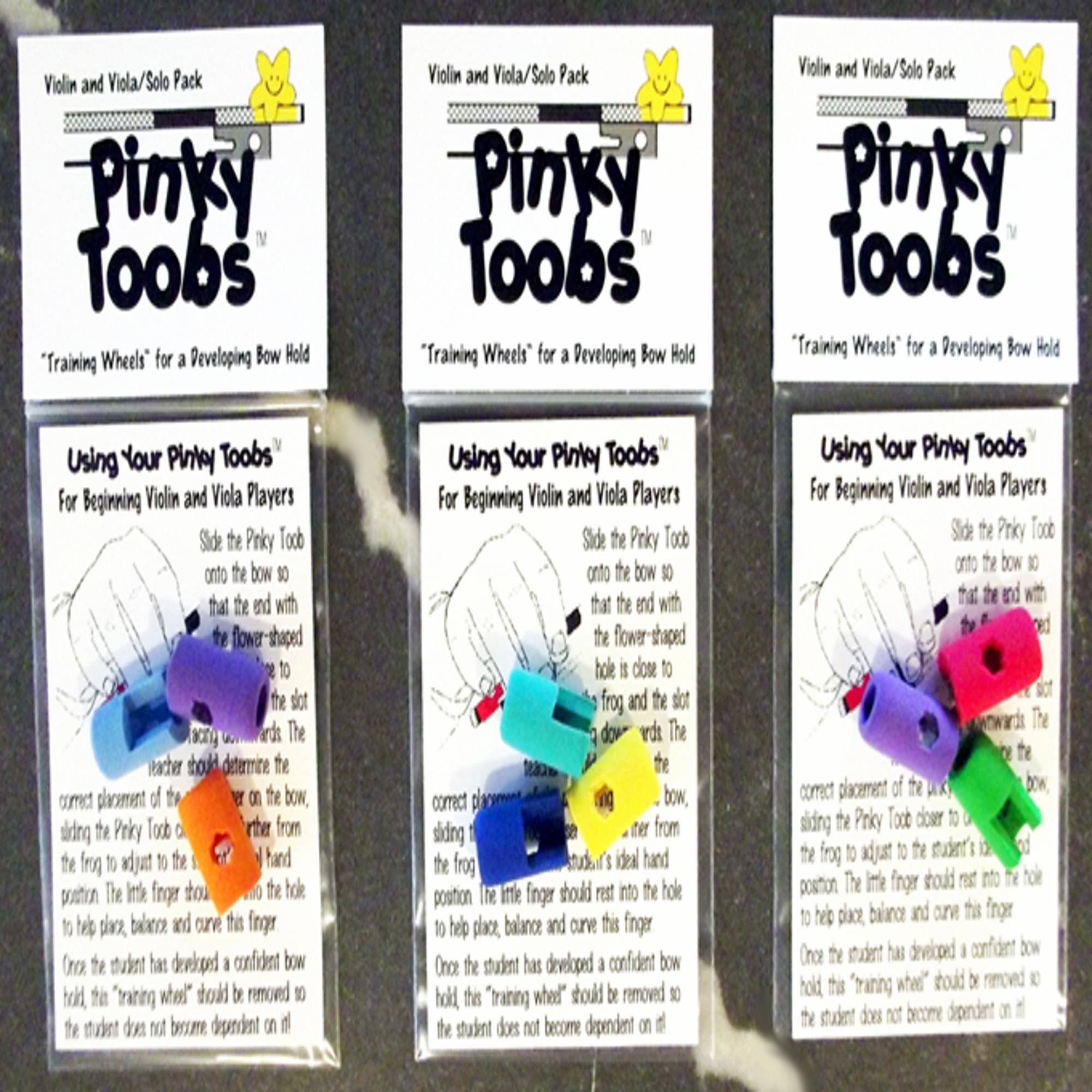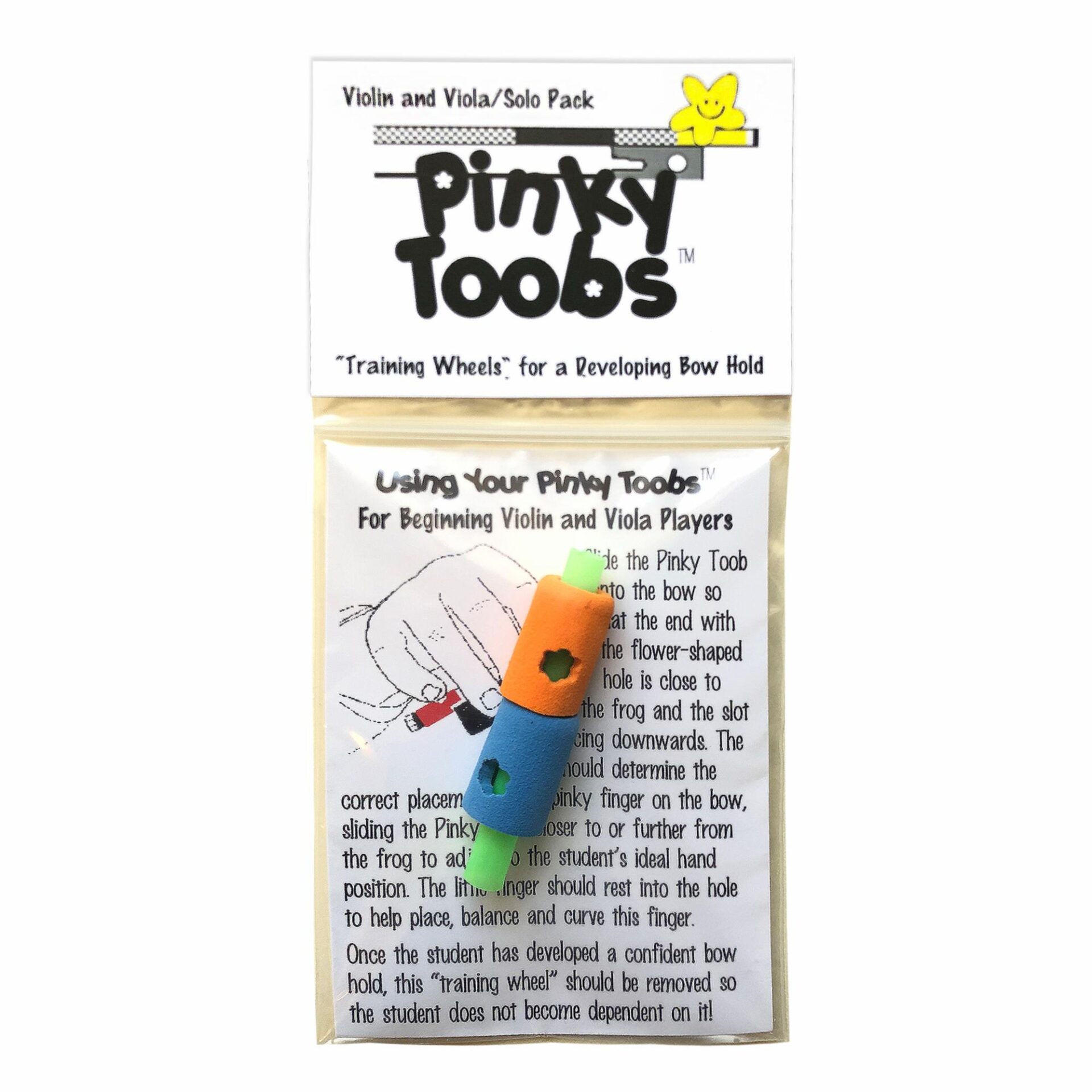 Pinky Toobs are made of soft, resilient foam that can be slipped right over the screw end of different sizes of bow. They are durable yet economically replaceable if lost or damaged. They sport a flower-shaped hole, which provides a tactile resting place for those wandering pinky fingers. They allow for flexible, individualized placement under a teacher’s direction.