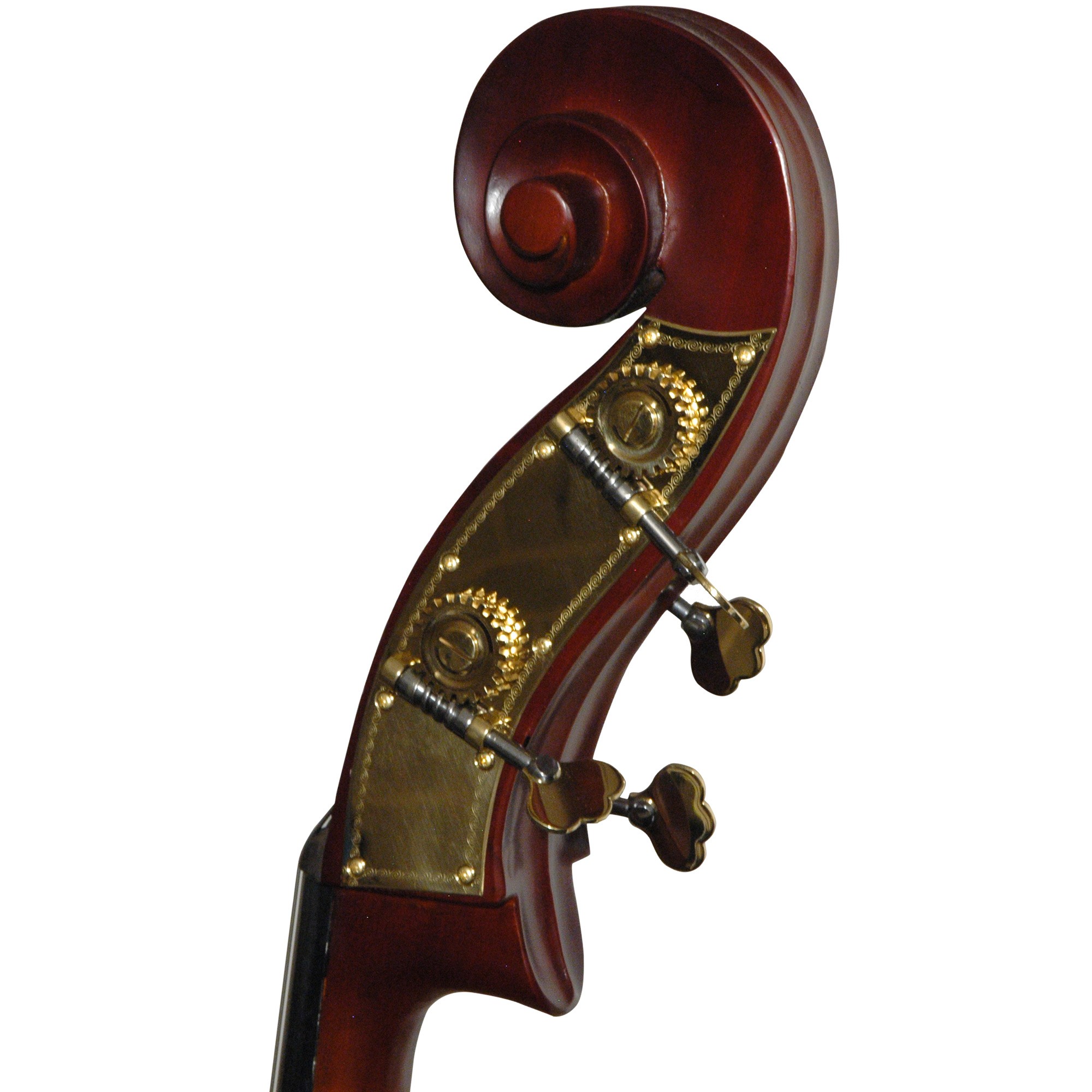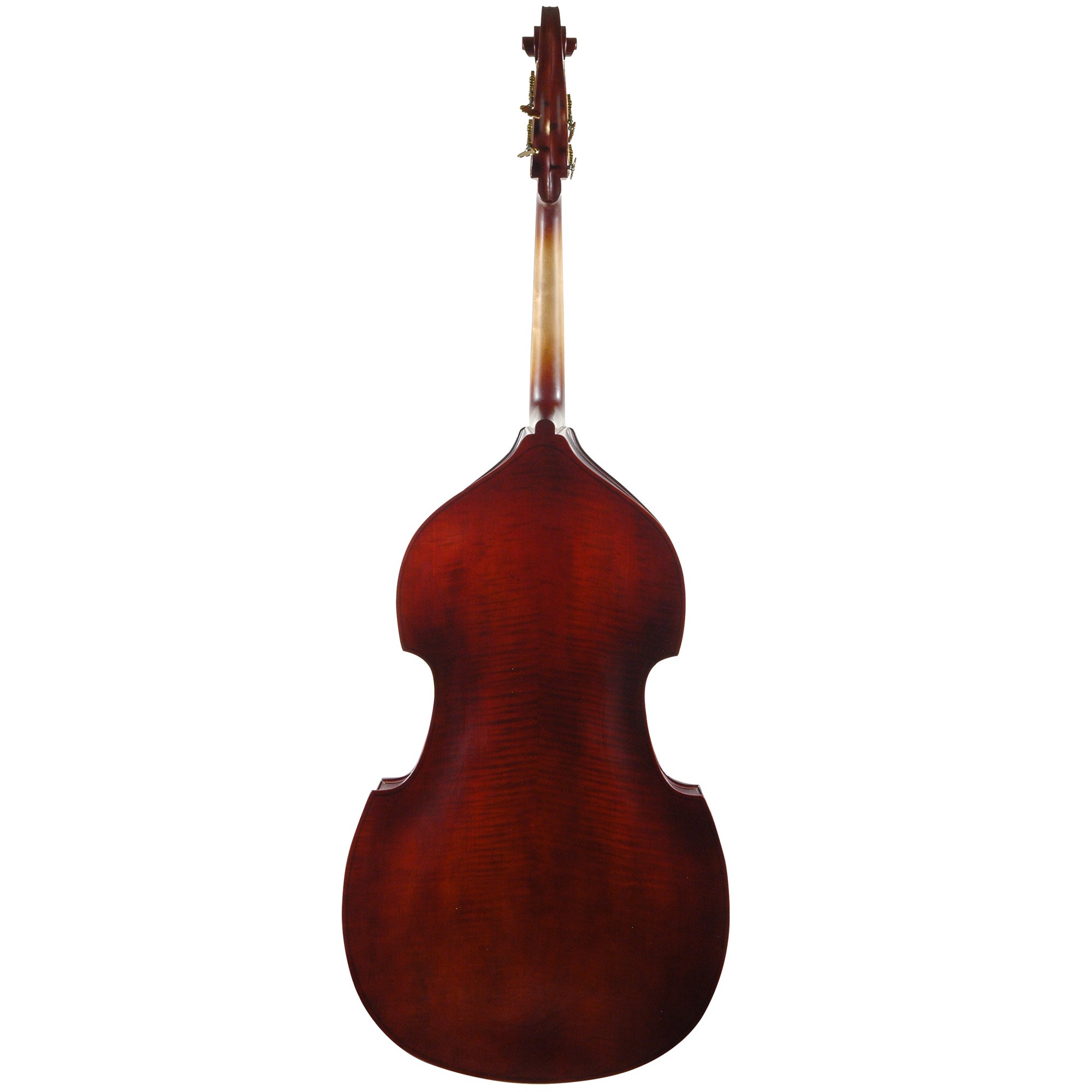 The Hans Kroger bass is constructed from solid spruce top of defined, medium grain. Inlaid purfling. Two piece, arched laminated back, light flame. Ribs slightly figured. Plain scroll. Finished in a spirit varnish of reddish-brown, shaded down to a golden ground. Outfit includes Pop’s bass rosin, case, and your choice of bow and frog. Made in China.