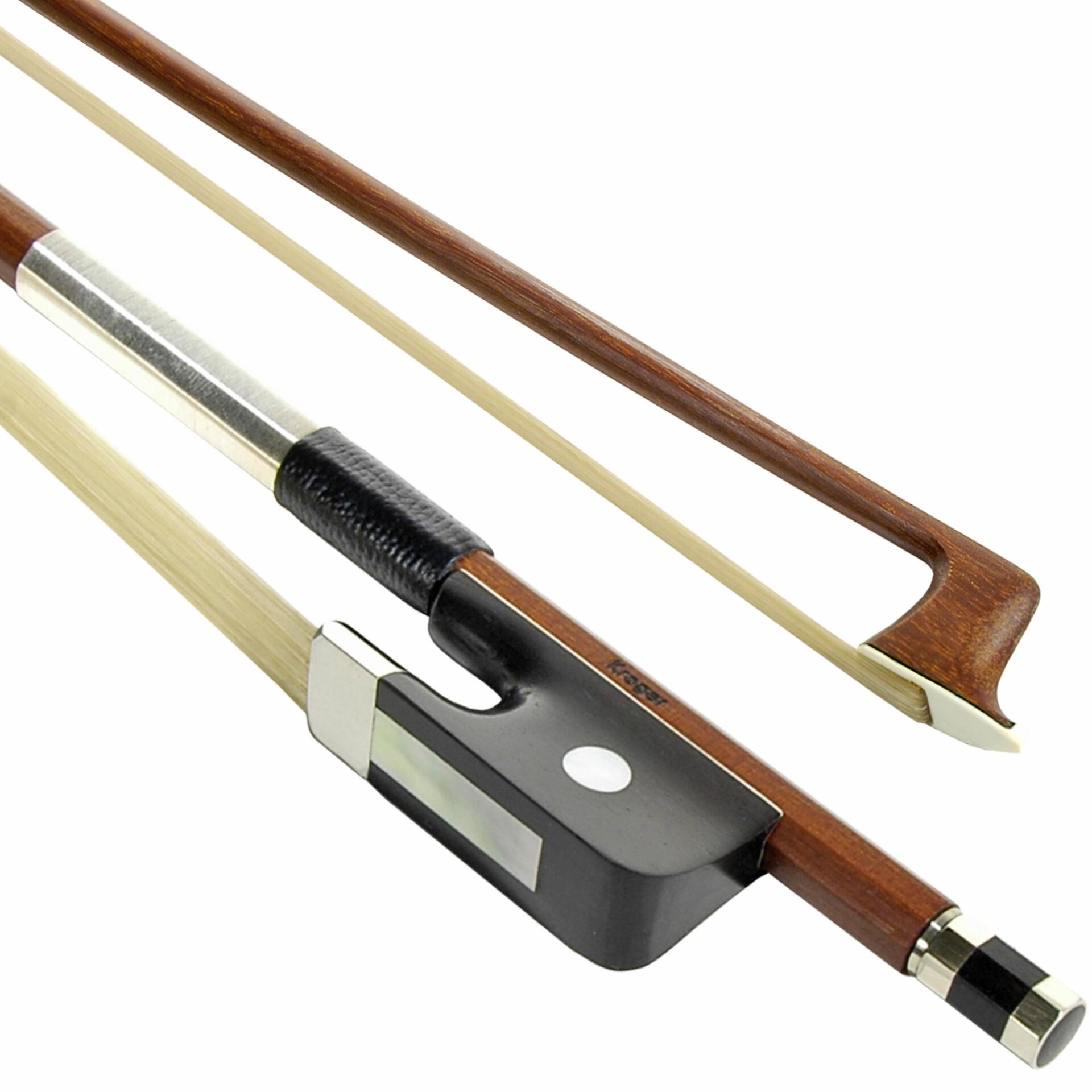 The Hans Kroger viola bow is our most affordable German made Brazilwood viola bow. This bow exhibits beautiful and clean European workmanship and is well suited for the intermediate player. The Hans Kroger viola bow has horsehair on a round Brazilwood stick, half mounted nickel-silver on an ebony frog with shell eye, solid adjuster and wire winding and leather grip. Stamped: Kroger