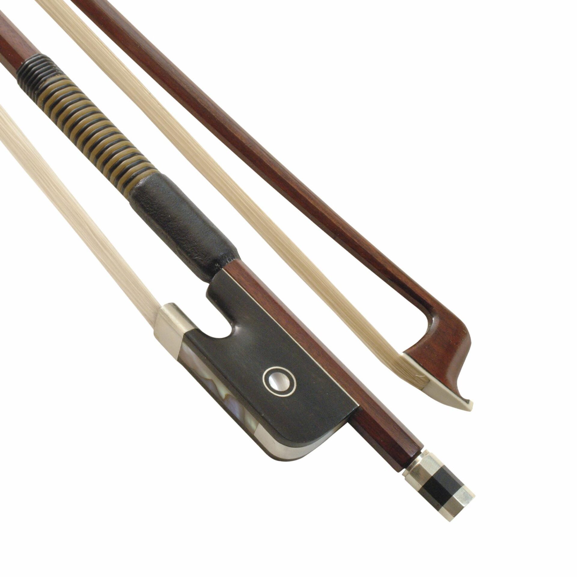 The Klaus Mueller viola bow has horsehair, a round Pernambuco stick, fully mounted nickel-silver on ebony frog with Parisian eye, three-part adjuster, faux whalebone winding and leather grip.