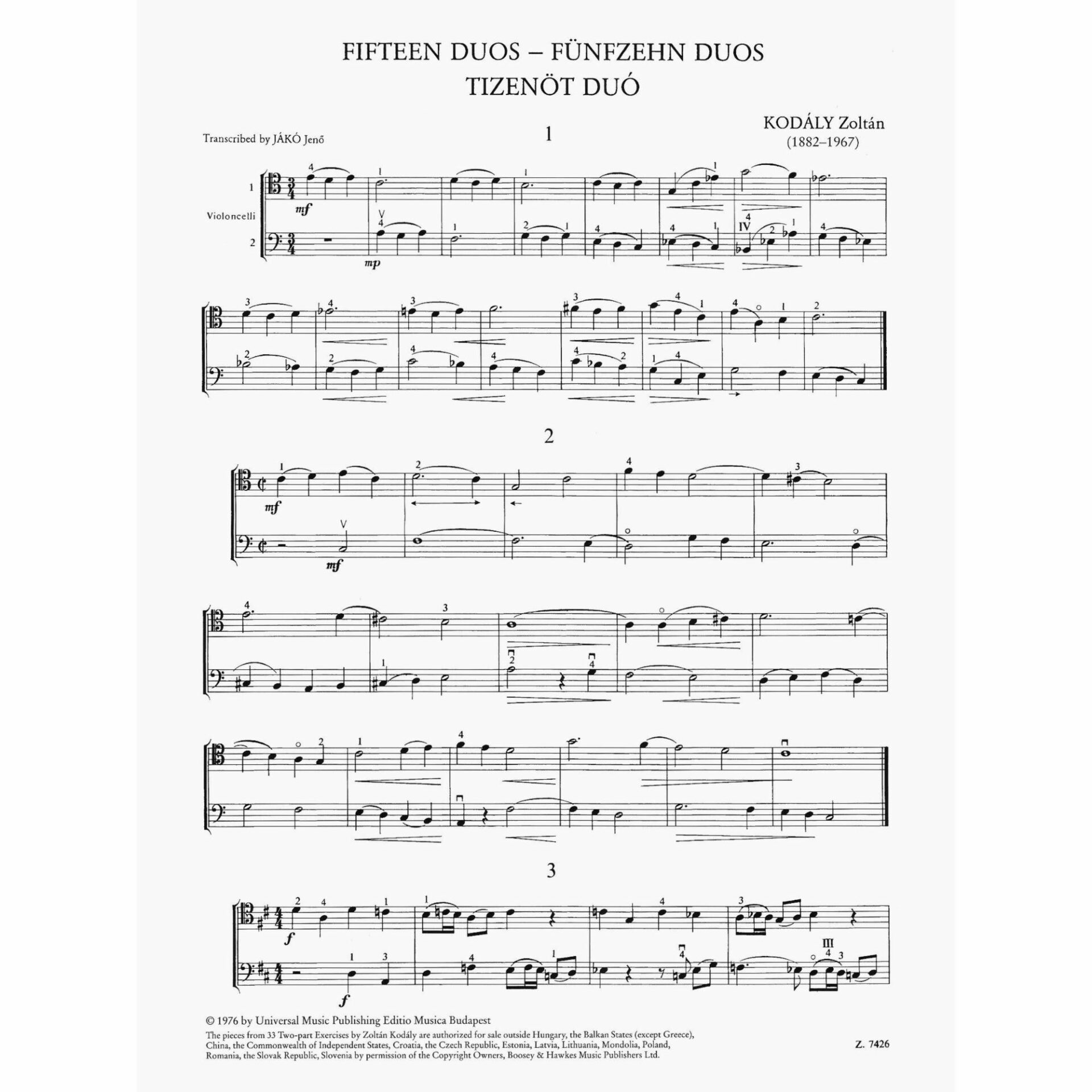 Kodaly — Fifteen Duos for Two Cellos