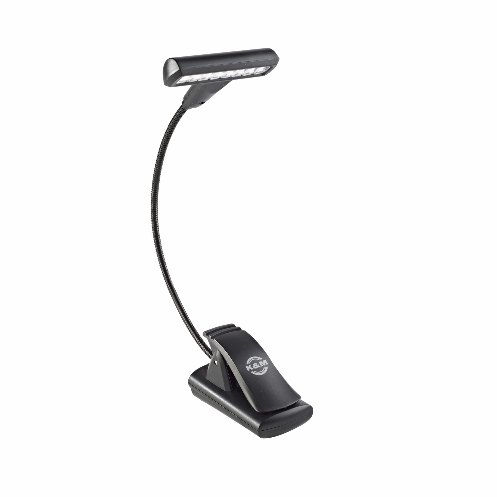 The extra-wide clip (up to 0.984″) attaches to music desks, table tops etc. It can also be used as a standing light. The T-Model is powered by 3 (1.5 V AAA) batteries (included) with a typical battery life of 10 hours or an AC adapter (not included). The light comes with a durable carrying case as well.