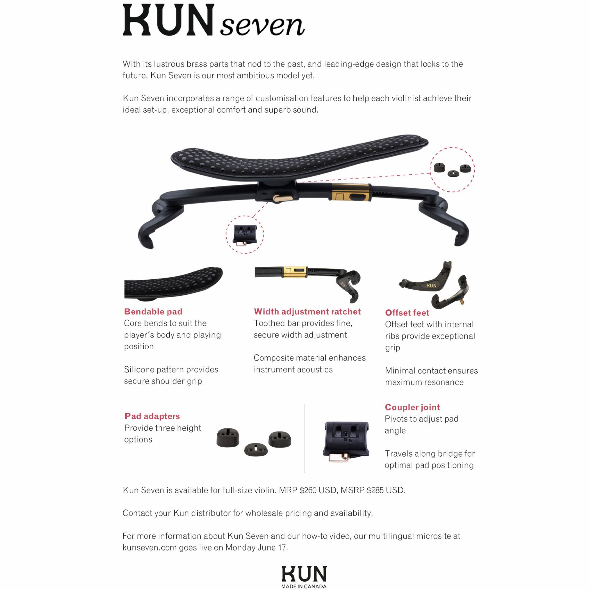 The Kun Seven Shoulder Rest incorporates a range of customization features that help each player achieve their ideal set up, exceptional comfort, and superb sound.