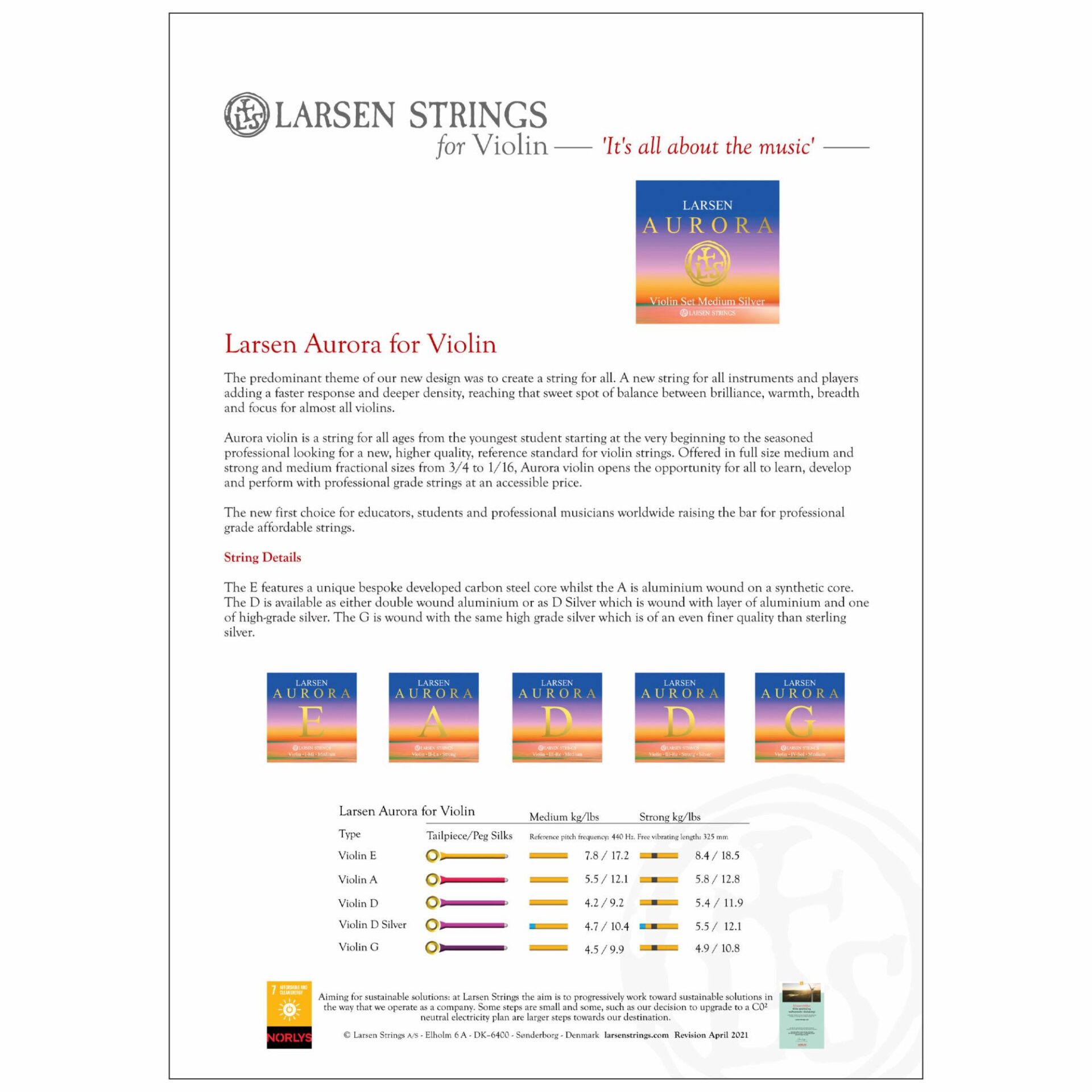 Aurora violin is a string for all ages from the youngest student starting at the very beginning to the seasoned professional looking for a new, higher quality, reference standard for violin strings. Offered in full size medium and strong and medium fractional sizes from 3/4 to 1/16, Aurora violin opens the opportunity for all to learn, develop and perform with professional grade strings at an accessible price.