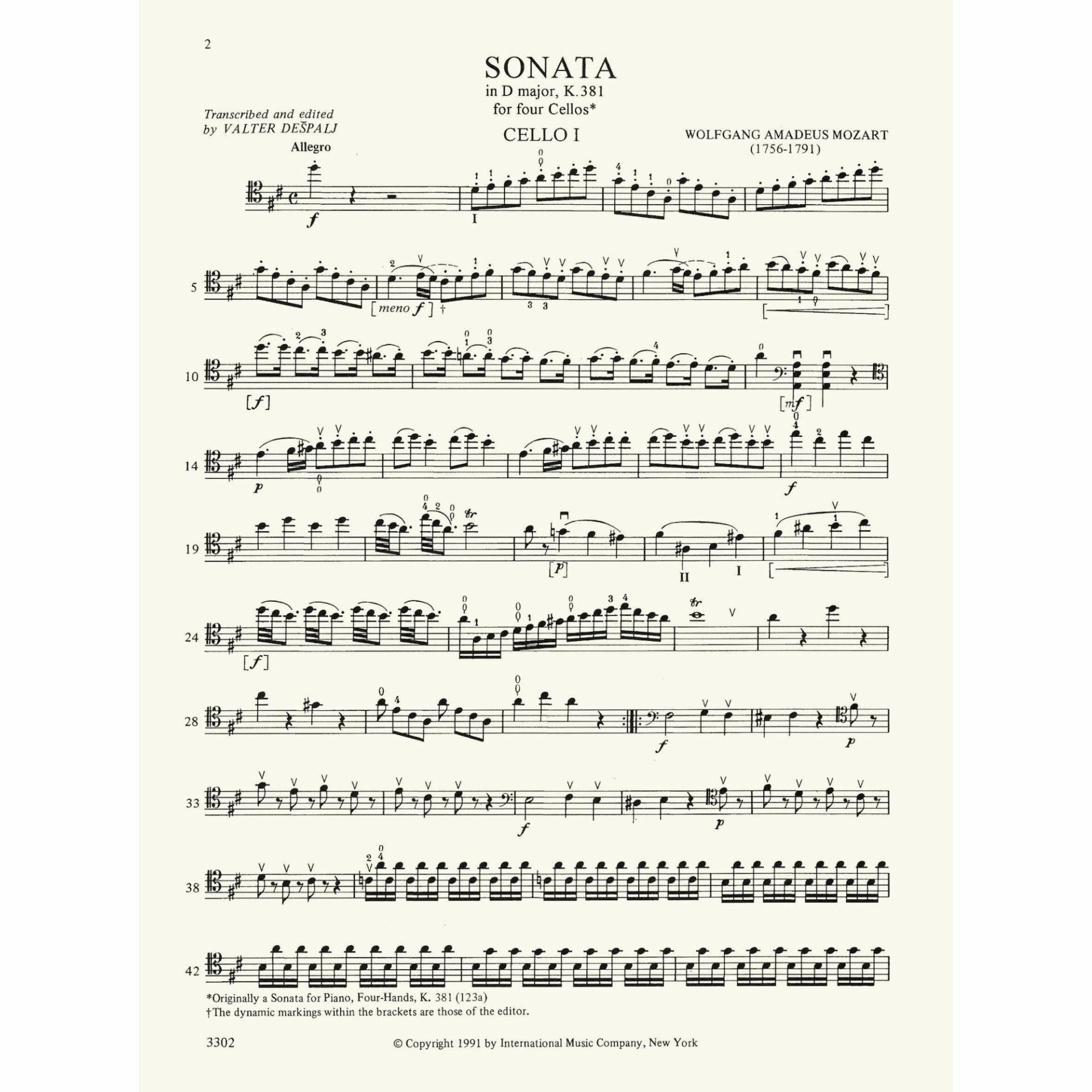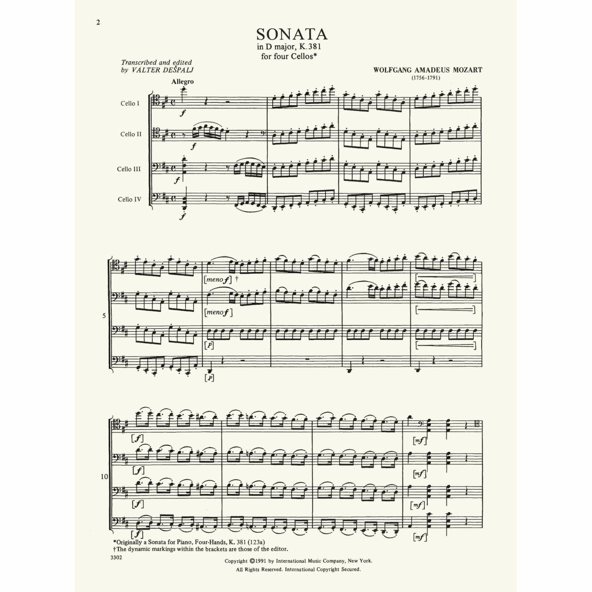 Mozart — Sonata in D Major, K. 381 for Four Cellos