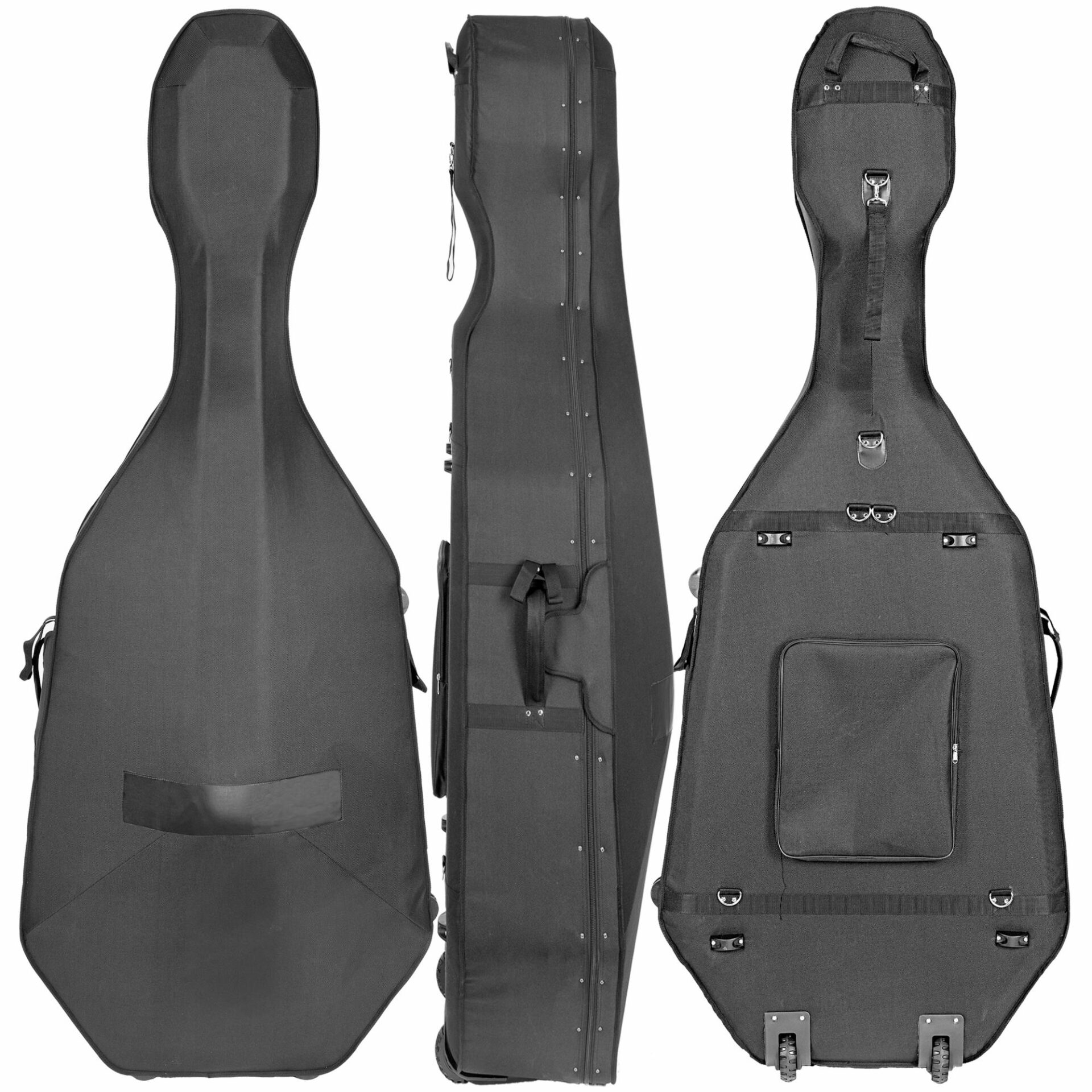 OX4100B Oxford Bass Case. Affordable, nicely appointed case. Zipper closure, nylon exterior with large music pocket. Padded velour interior with two bowholders and accessory pocket. Black exterior, blue interior.