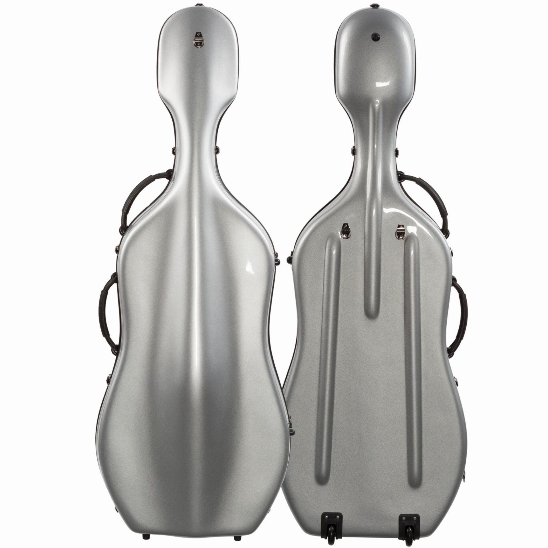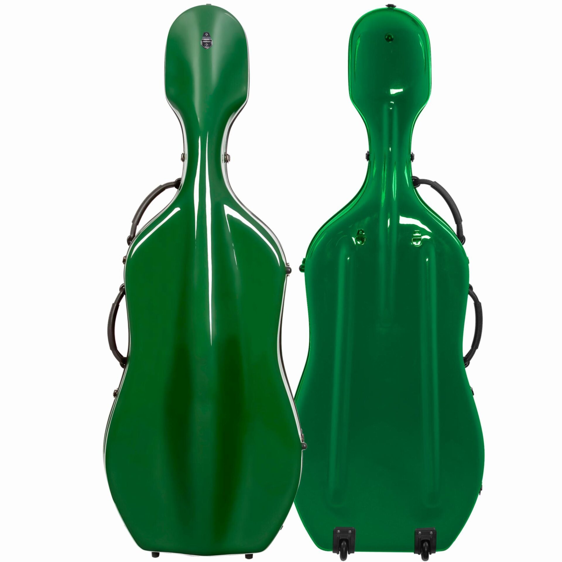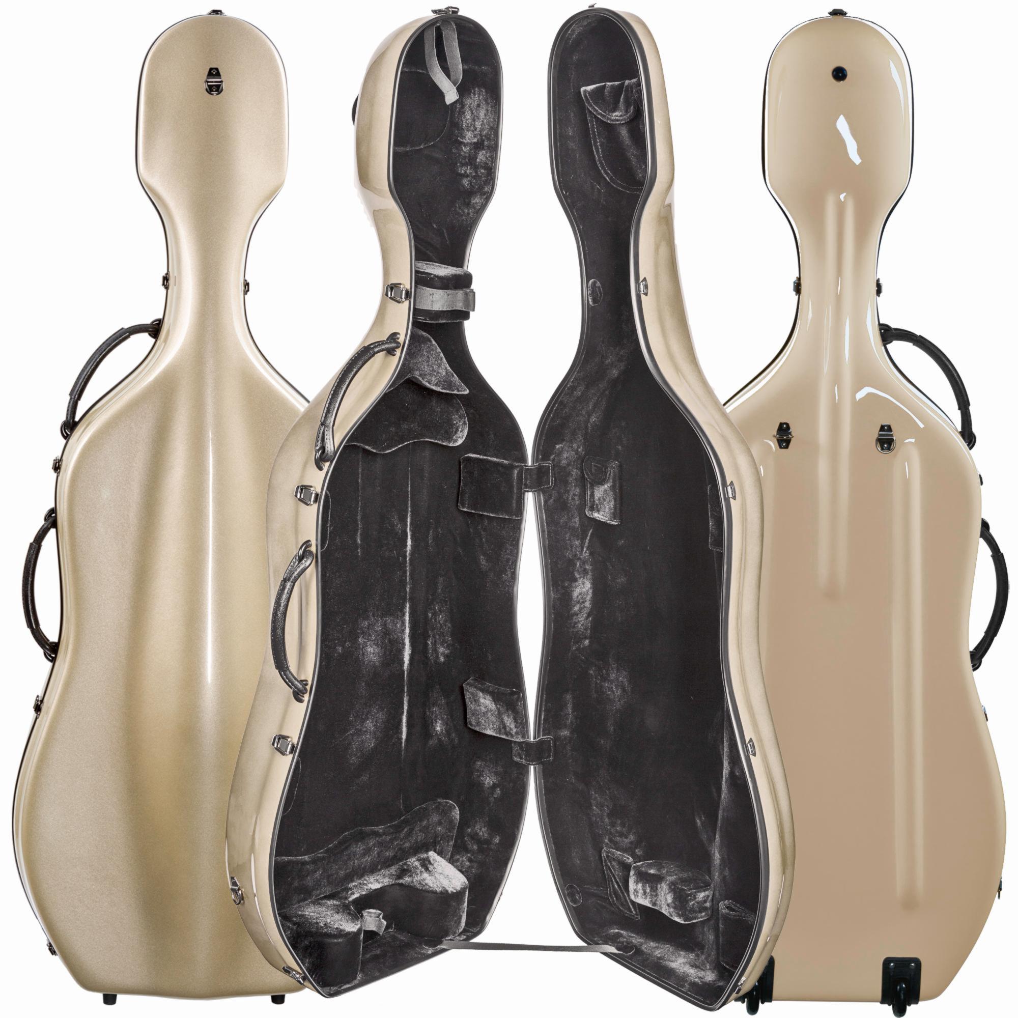 OX4300 Oxford fiberglass cello case. Strong fiberglass shell. Eight exterior colors, all with black fittings and black interior. Two durable rubber carry handles, backpack straps, and wheels for easy transportation. Interior features a suspension system, two bowholders, and accessory pocket. Includes detachable pull-strap.