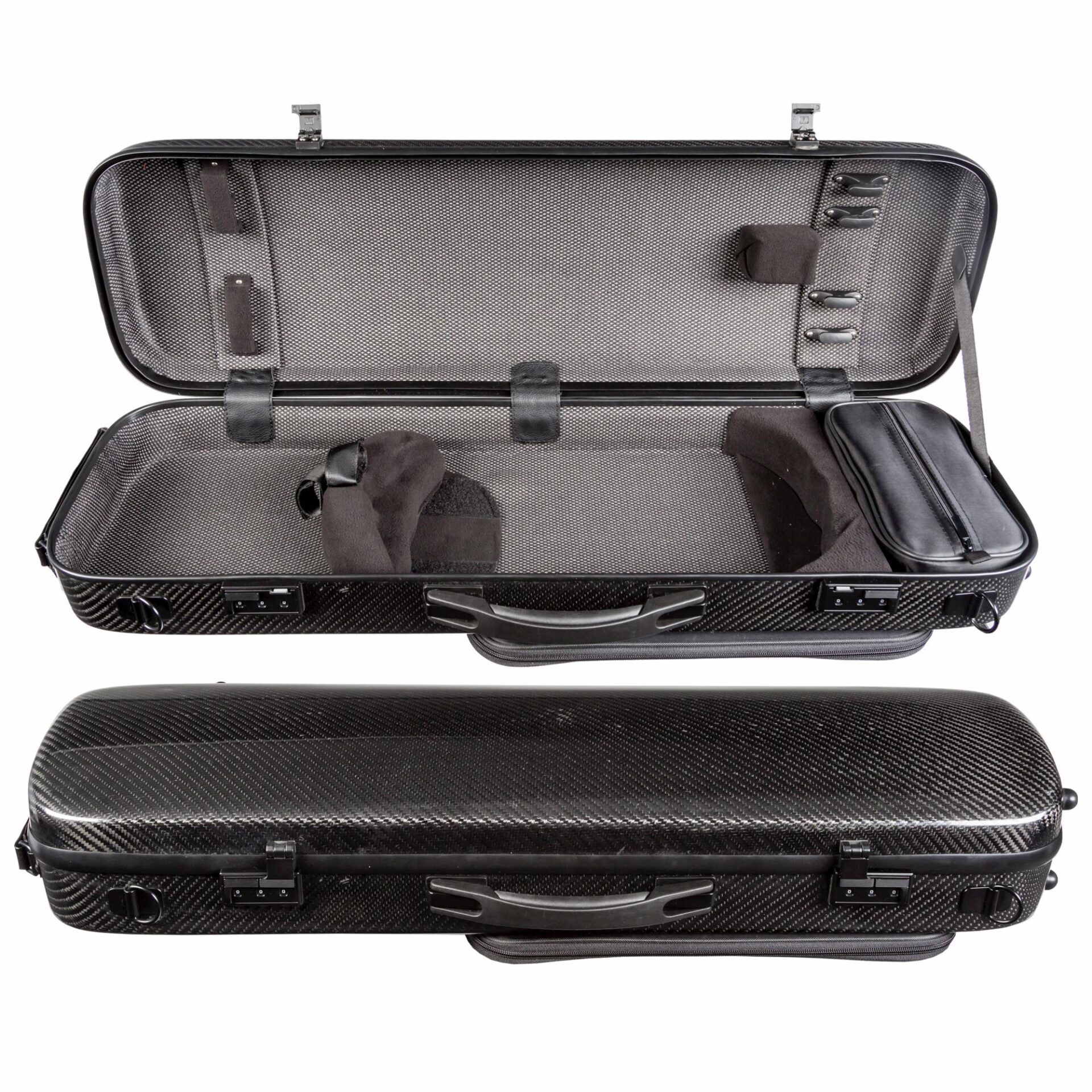 The OX815 has a pure carbon weave shell. It is exceptionally strong and highly protective, and also comes with upgraded latches. The attached external music pocket doubles as a backpack pad. The interior features a gray, Euro-styled lined shell with plush suspension pads, zippered accessory pocket, shoulder rest strap, and four bow holders. Back pack straps are included.