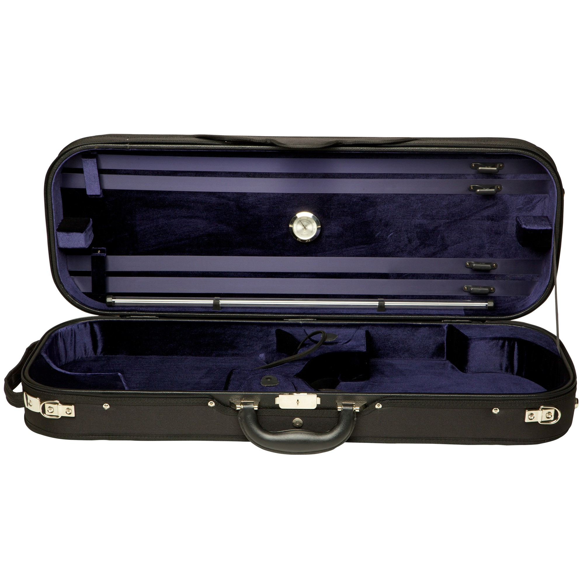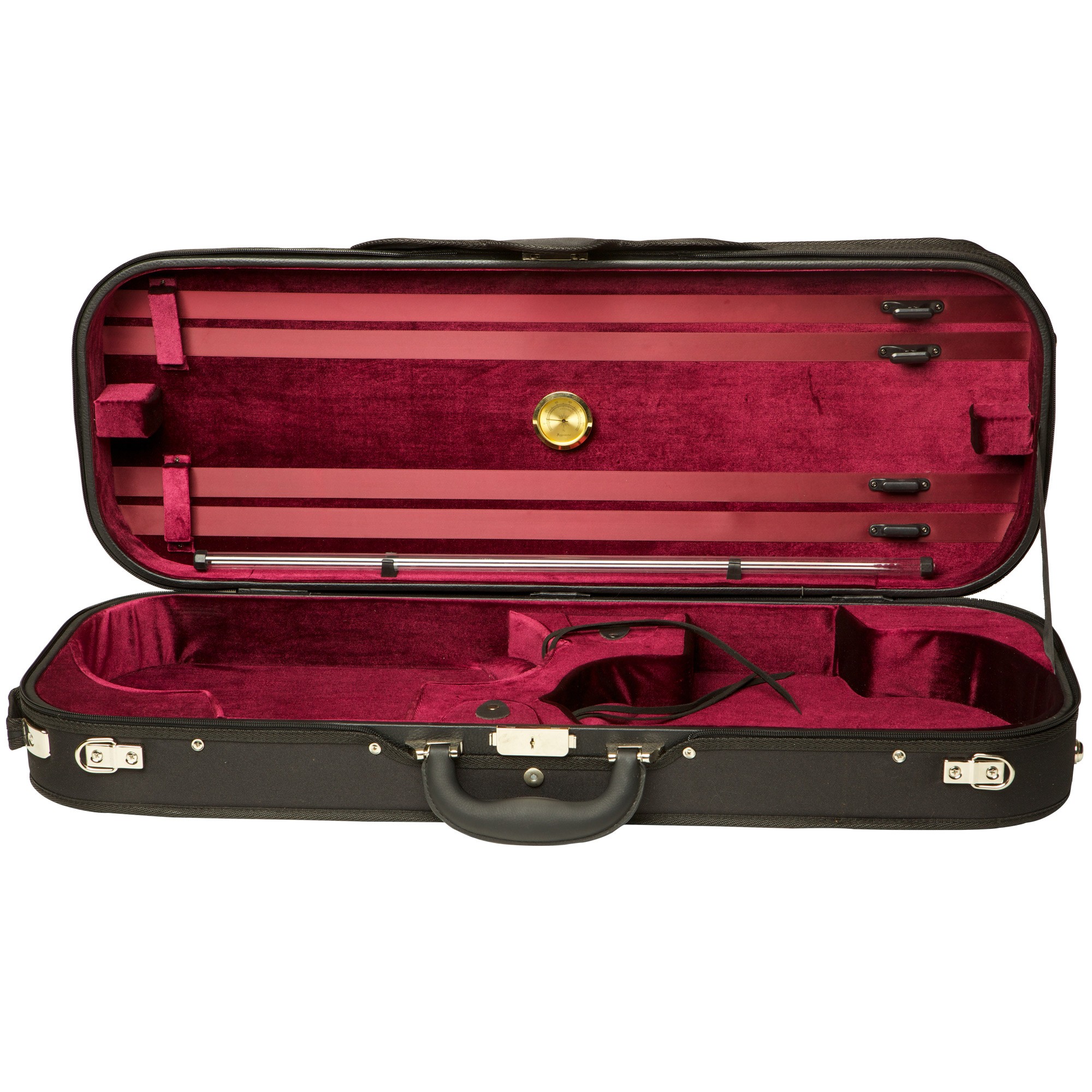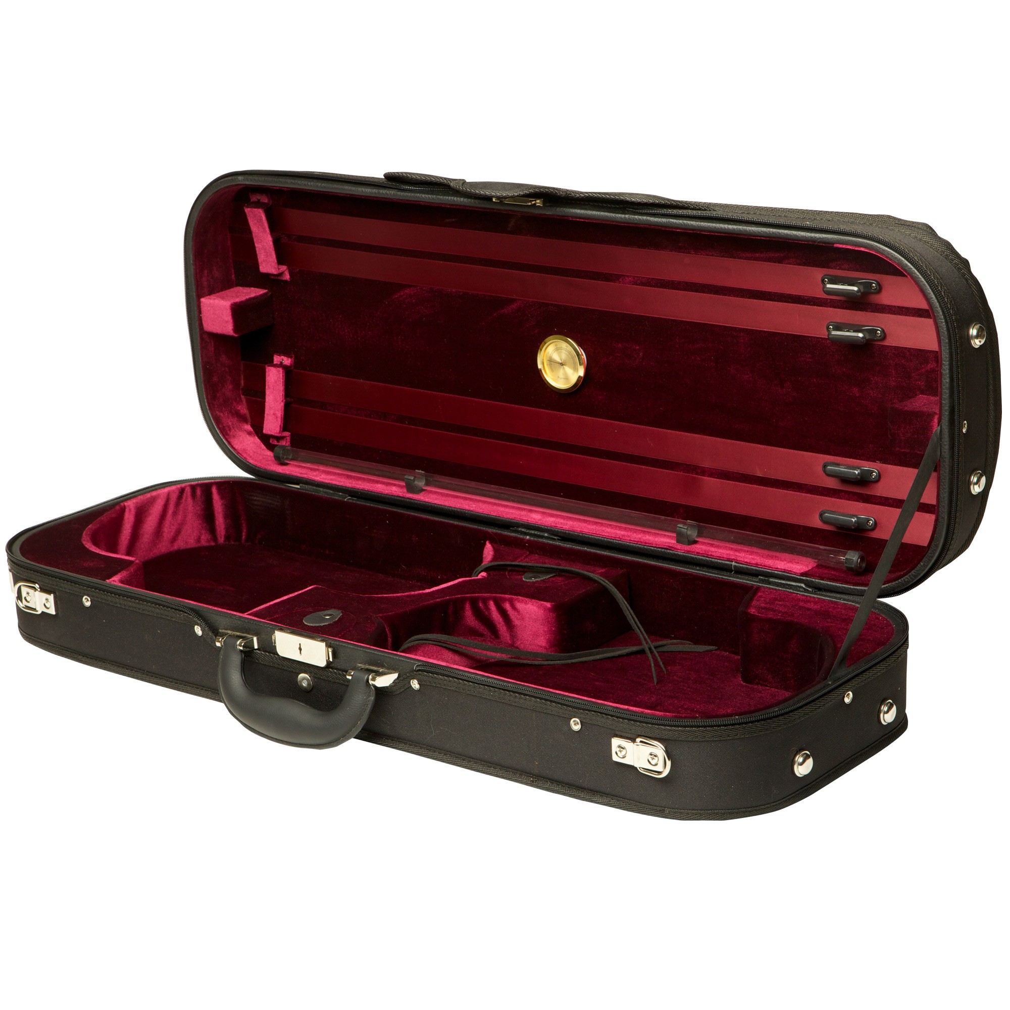 Interior Features: Two small accessory pockets. Soft suspension feature and Velcro neck anchor holds each instrument firmly in place. Four bow holders. Includes string tube, hygrometer, and matching blanket.