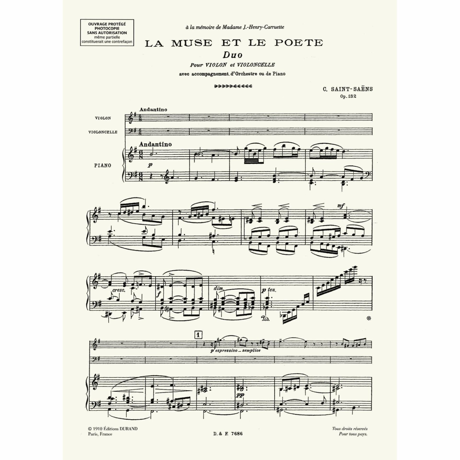 Saint-Saens — La Muse et le Poete, Op. 132 for Piano Trio