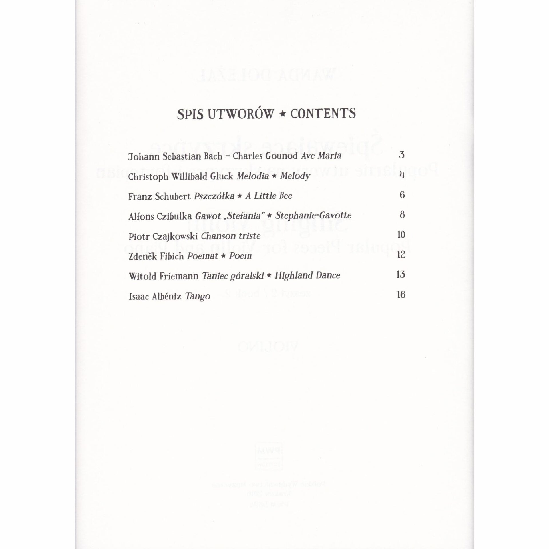 Singing Violin: Popular pieces for violin and piano.  Includes works by Wieniawski, Brahms, Schubert, and others (see photographs for contents).  Edited by Wanda Dolezal.  With illustrations by Joanna Rusinek.  Published in two volumes by PWM Edition.