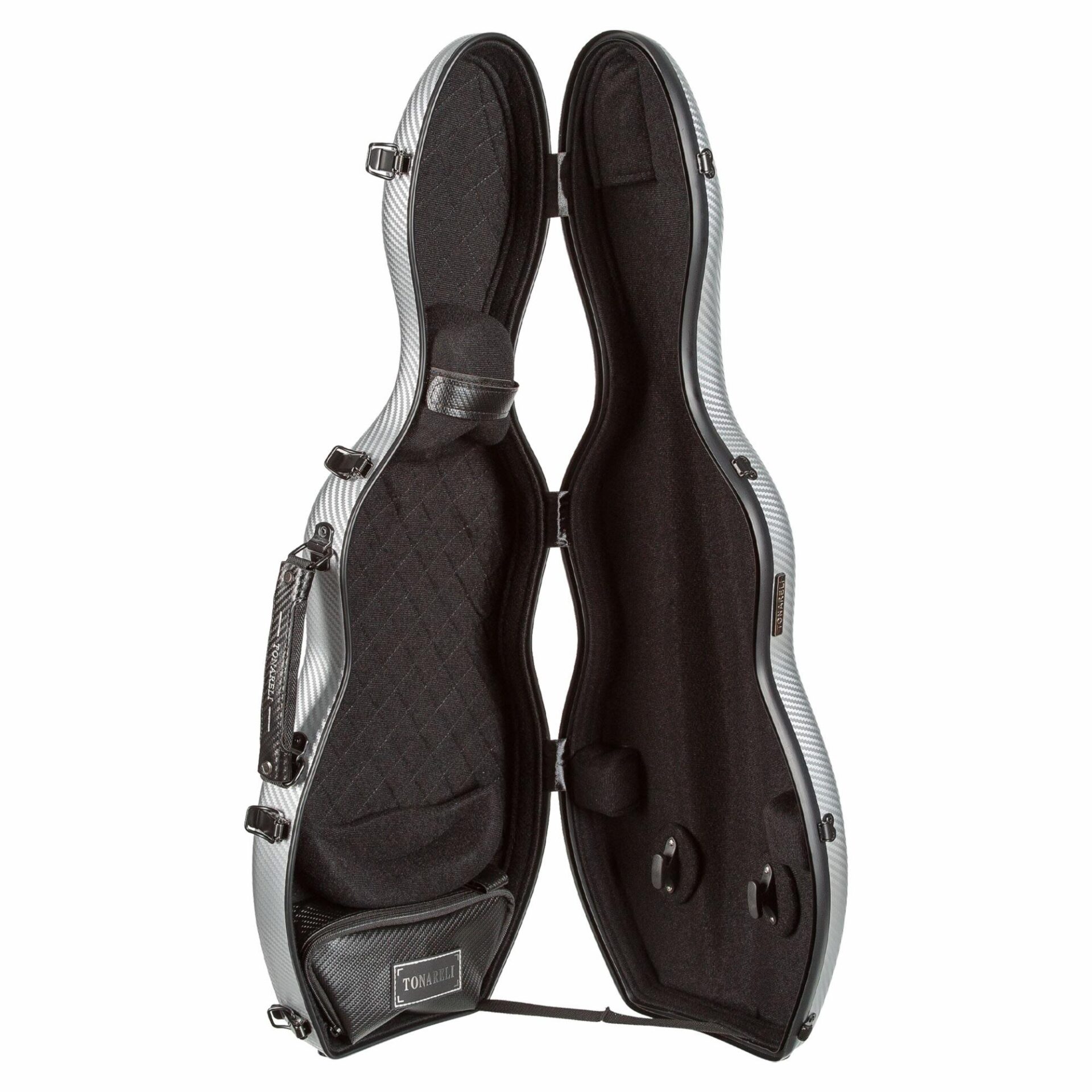 The Tonareli cello-shaped polycarbonate violin cases are an affordable and stylish case to protect your prized instrument. Constructed using a state of the art process with four layers of materials, the case is sealed when closed so your instrument is protected from both inclement weather and sudden temperature changes. The case has a new bow holder design to securely hold two bows. There is a removable accessory compartment for rosin, strings, mutes, cleaning cloth, etc. Each case comes with two shoulder straps and a violin blanket.
