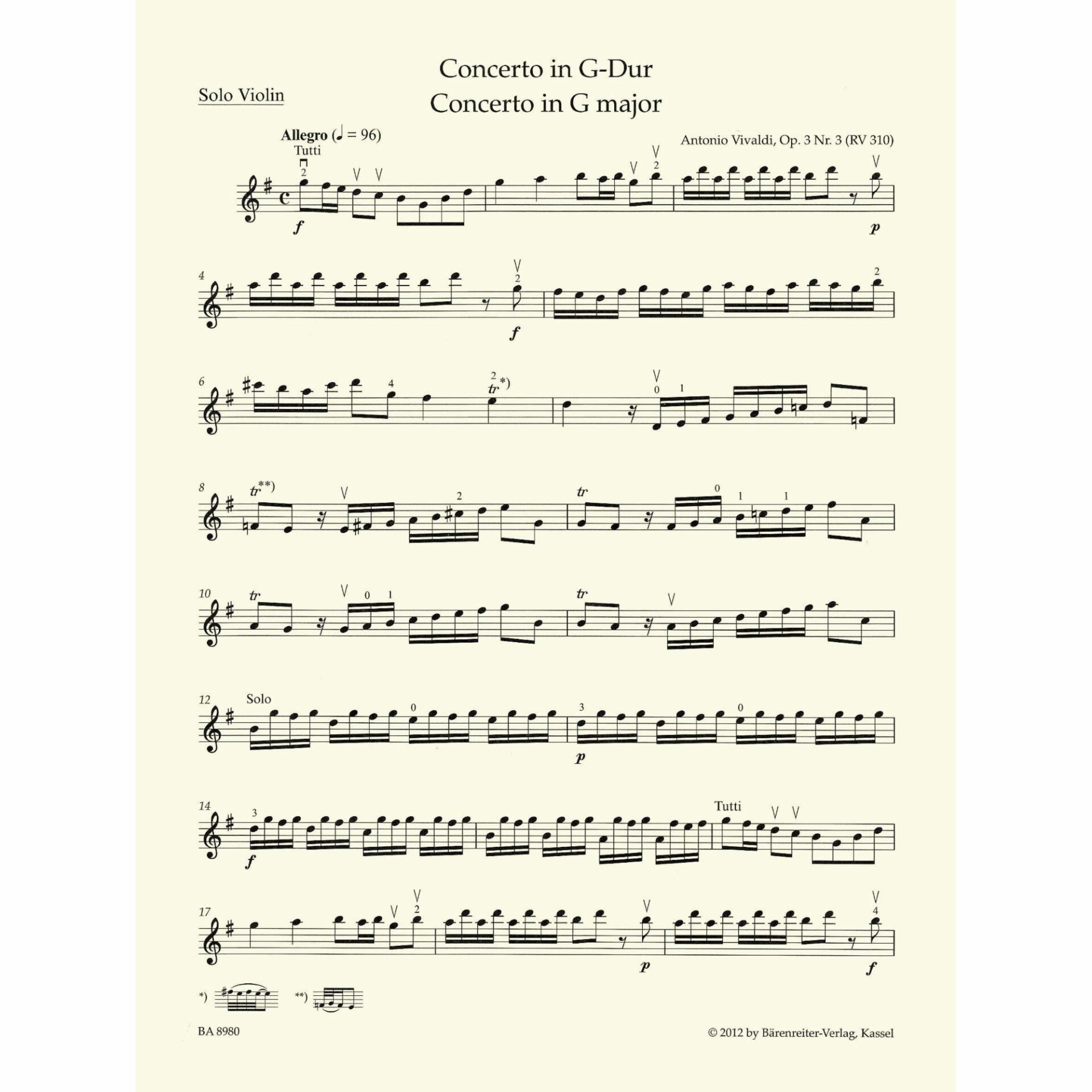 Concerto in G major for violin and piano, op. 3, no. 3 (RV 310). Originally for violin and orchestra. Antonio Vivaldi. Edited by Kurt Sassmannshaus. Part of Barenreiter’s Easy Concerto series.